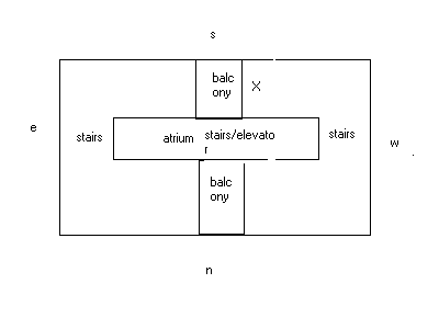 Anyway, here is the sketch of the building. I am in the south area marked X. The building is not L-shaped nor U-shaped, just the units. Therefore, my right door neighbor is missing its Northeast component. To my left is a balcony so wind flows freely here. There is, however, an open space in the middle marked atrium. My front door is partially in the area of the elevator. The garbage chutes are in the west and east. I hope this helps. Thanks again.